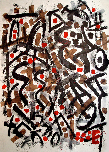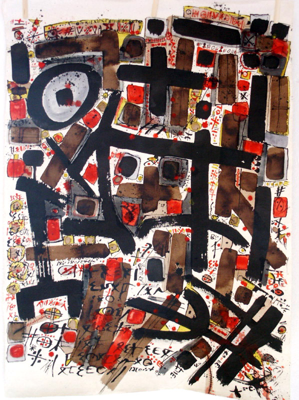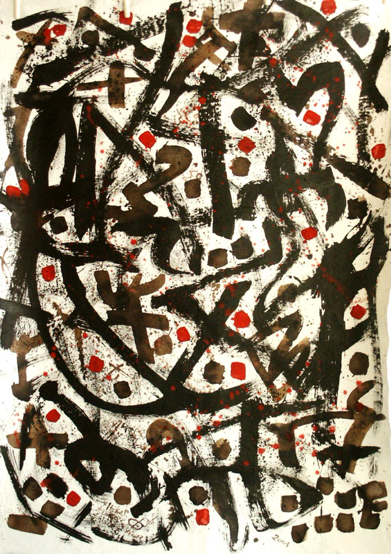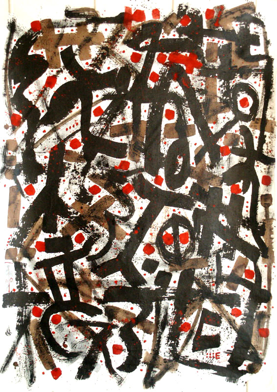 La « furigraphie », c’est tout un dédale de gestes et d’états psychiques disparates qui n’ont rien en commun, sauf un fil qui les relie […]. Donc, à partir de là, j’ai deux gestes. D’abord, le geste net, tranché et en même temps généreux, comme une rafale de sabre. Et ceux qui sont chargés de couleur ocre, où tout est comme une litanie de signes tifinagh et de voix en marche jusqu’à l’infini. Cela signifie ce que je cherche à montrer et à exprimer : la cavale au galop des gestes, des images et des imaginations, qui s’emballent.